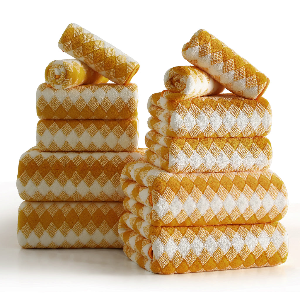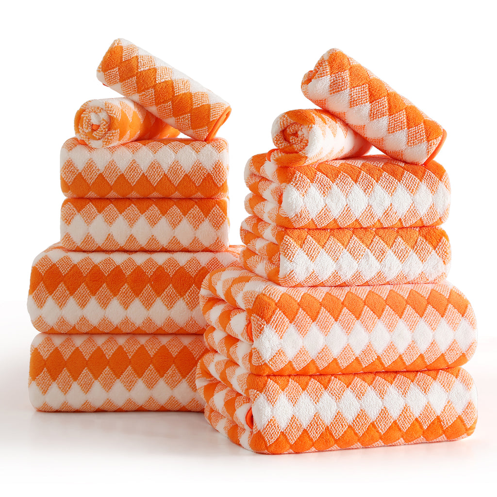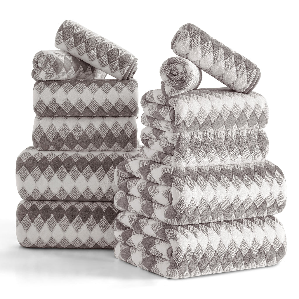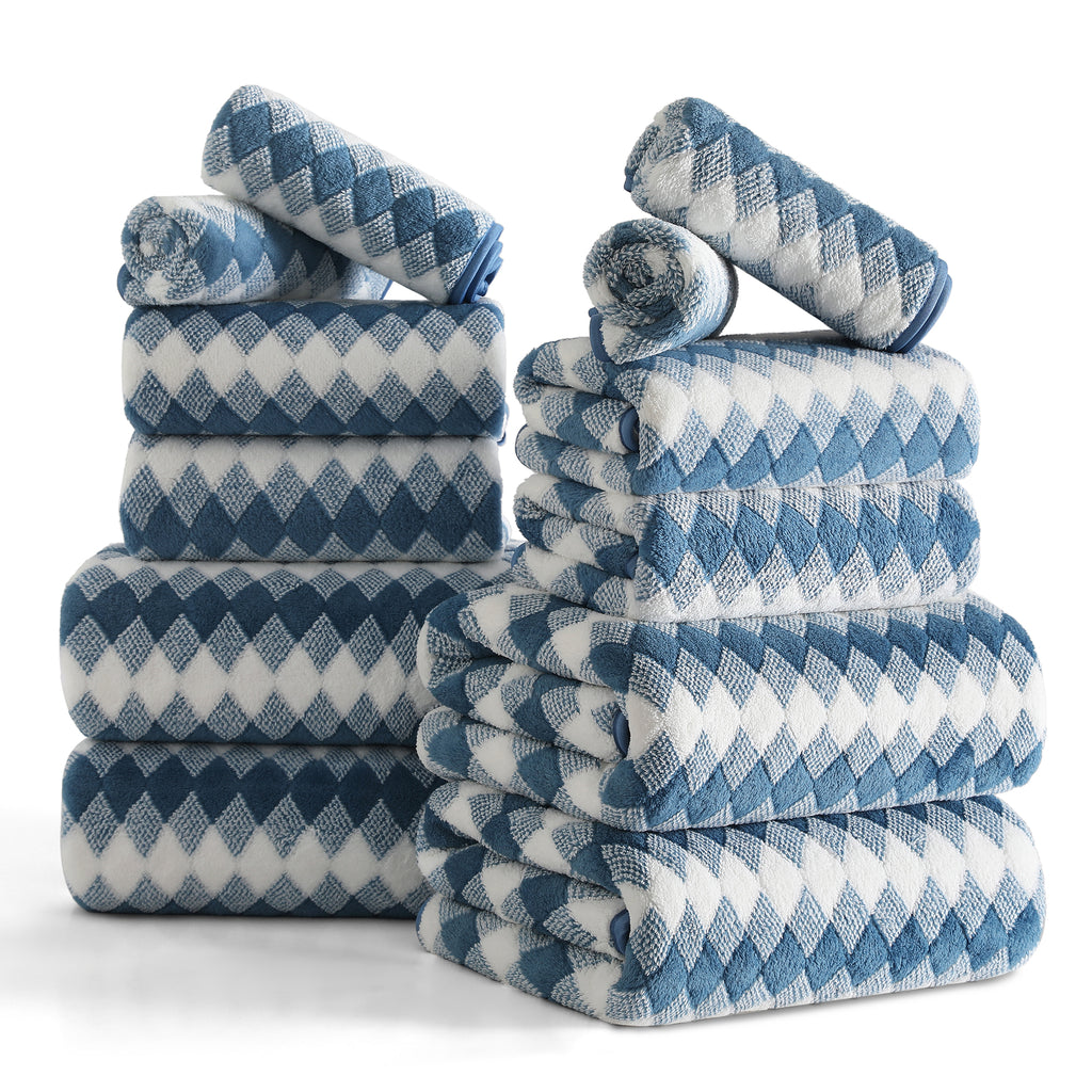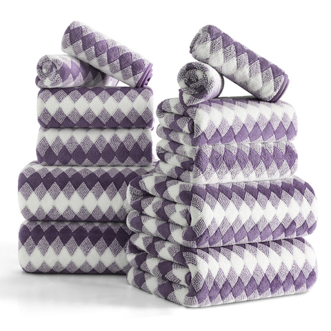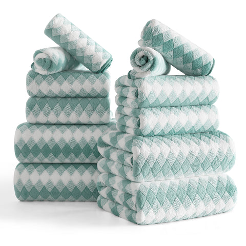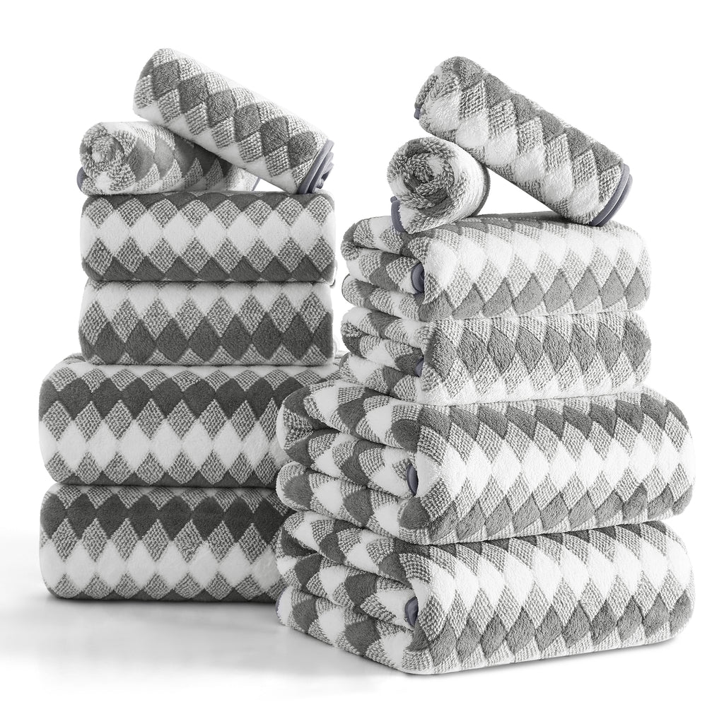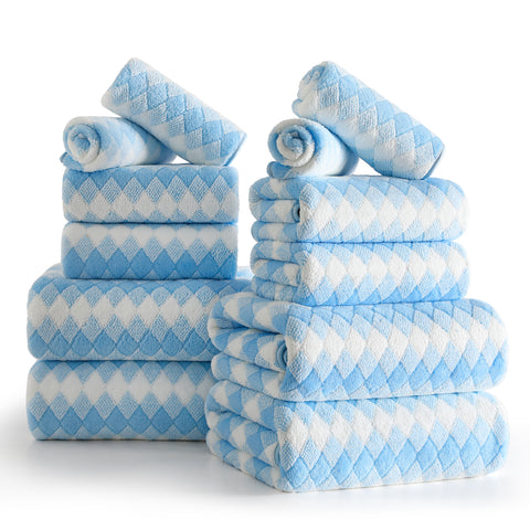 12 SOFT PLUSH BATH TOWEL SET: 4 pieces 28” * 60”bath towels, 4 pieces 16"*31" hand towel and 4 pieces 13"*13" Washcloths. This bath sheet set are made up of 100% Microfiber and plush soft fleece material.Bath towels feel soft and cozy. Bathroom towels have high water absorption and fluffy, can quickly absorb the moisture. High quality microfiber ensure optimum softness, fluffiness and wonderful absorbency. Luxury bathroom towels soft fluffy and warm, oversize bathroom towels can fully meet your needs. You can use it in gyms, shower rooms, beaches, swimming pools, spas, hotels, etc. Bath towel edges with professional hemmed seaming finish, 600 GSM towels have a reinforced double stitched hem, designed to prevent fraying and tearing. Wash before use, machine wash in cold, tumble dry low, do not iron. This towel can be washed and reused hundred of times which remain soft after multiple wash and dry cycles.