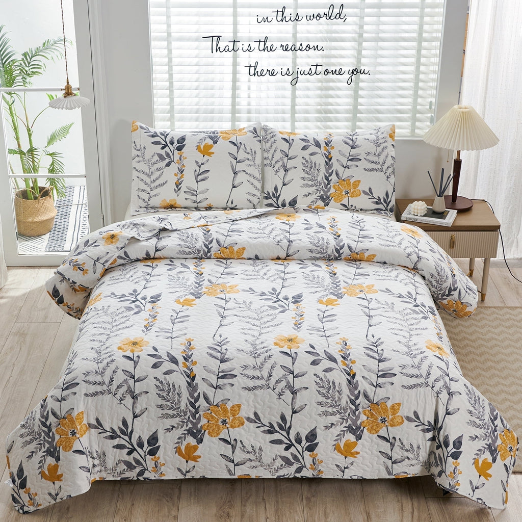 Jessy Home Twin/Queen/King Quilt Set Yellow Floral Reversible Microfiber Bedspread Coverlet Set